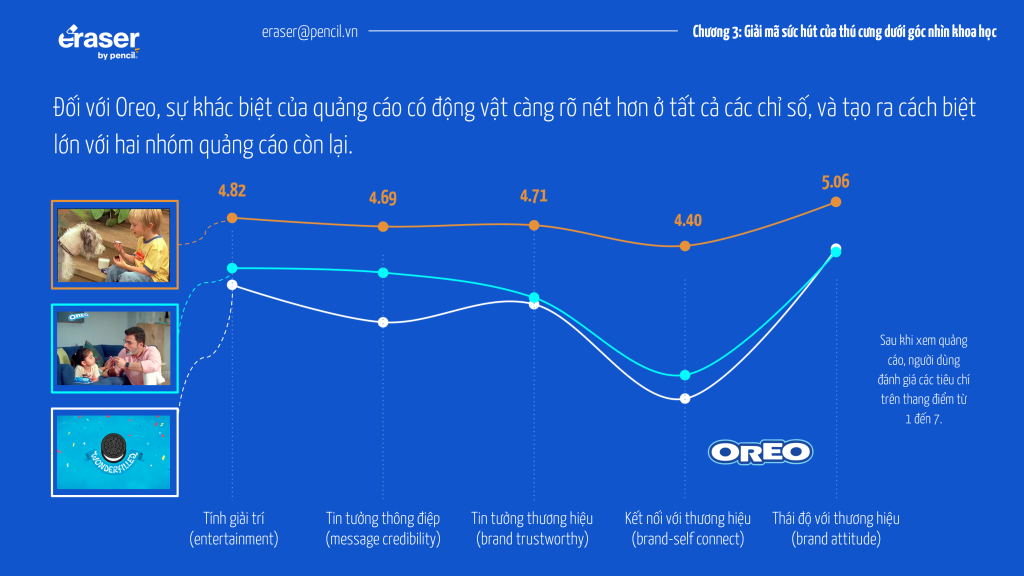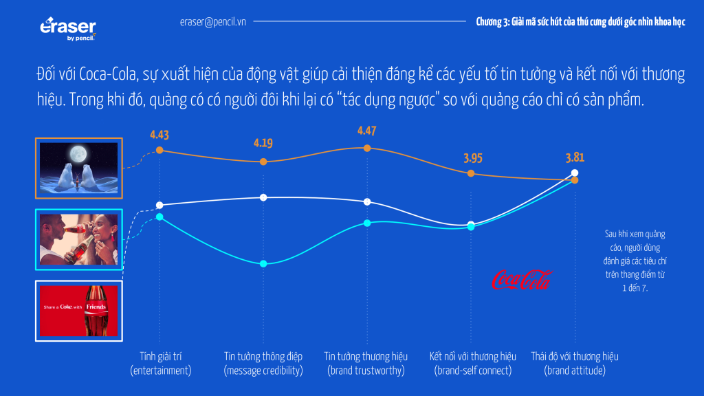 Lí do đầu tiên cho cuộc “xâm lăng” này đến từ việc quảng cáo có xuất hiện động vật sẽ củng cố niềm tin và tăng tính kết nối với thương hiệu. Cụ thể, các quảng cáo này giúp tăng chỉ số “tin tưởng thông điệp” và “tin tưởng thương hiệu” lên từ 1,3 đến 2 lần so với quảng cáo chỉ có sản phẩm và con người, như trường hợp tăng trưởng chỉ số của Coca-Cola & Oreo dưới đây (theo nghiên cứu từ Stoeckel, L và các cộng sự, đăng vào năm 2014).