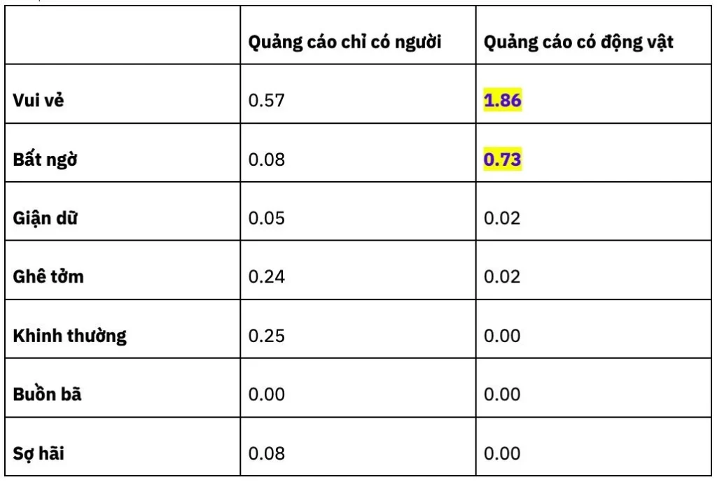 Yếu tố thứ hai đến từ việc động vật mang lại hiệu ứng vui vẻ và bất ngờ cao hơn hẳn so với quảng cáo chỉ có con người. Bên cạnh đó, những cảm xúc tiêu cực cũng được giảm thiểu đáng kể hoặc thậm chí không có đối với sự xuất hiện của động vật.