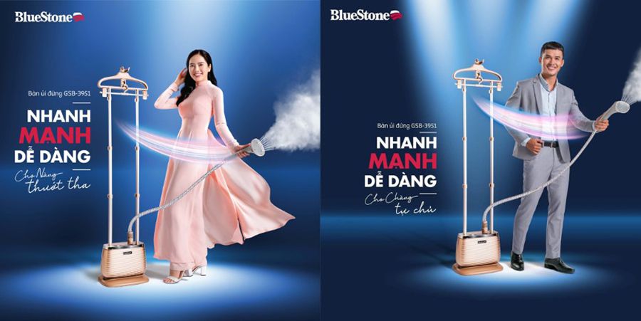 Với sản phẩm bàn ủi đứng, Bluestone đã thực hiện cùng lúc 2 thông điệp cho cả nam và nữ. Thể hiện vai trò của người đàn ông trong việc ủi quần áo cũng tương đương so với người phụ nữ. Sản phẩm nồi chiên không dầu cũng được nhãn hàng Bluestone thực hiện một chiến dịch cũng với thông điệp liên quan đến bình đẳng giới: “Nồi chiên Thạch Sanh, mình Anh cân tất”, với mong muốn khuyến khích người đàn ông tham gia chia sẻ công việc bếp núc với người phụ nữ.